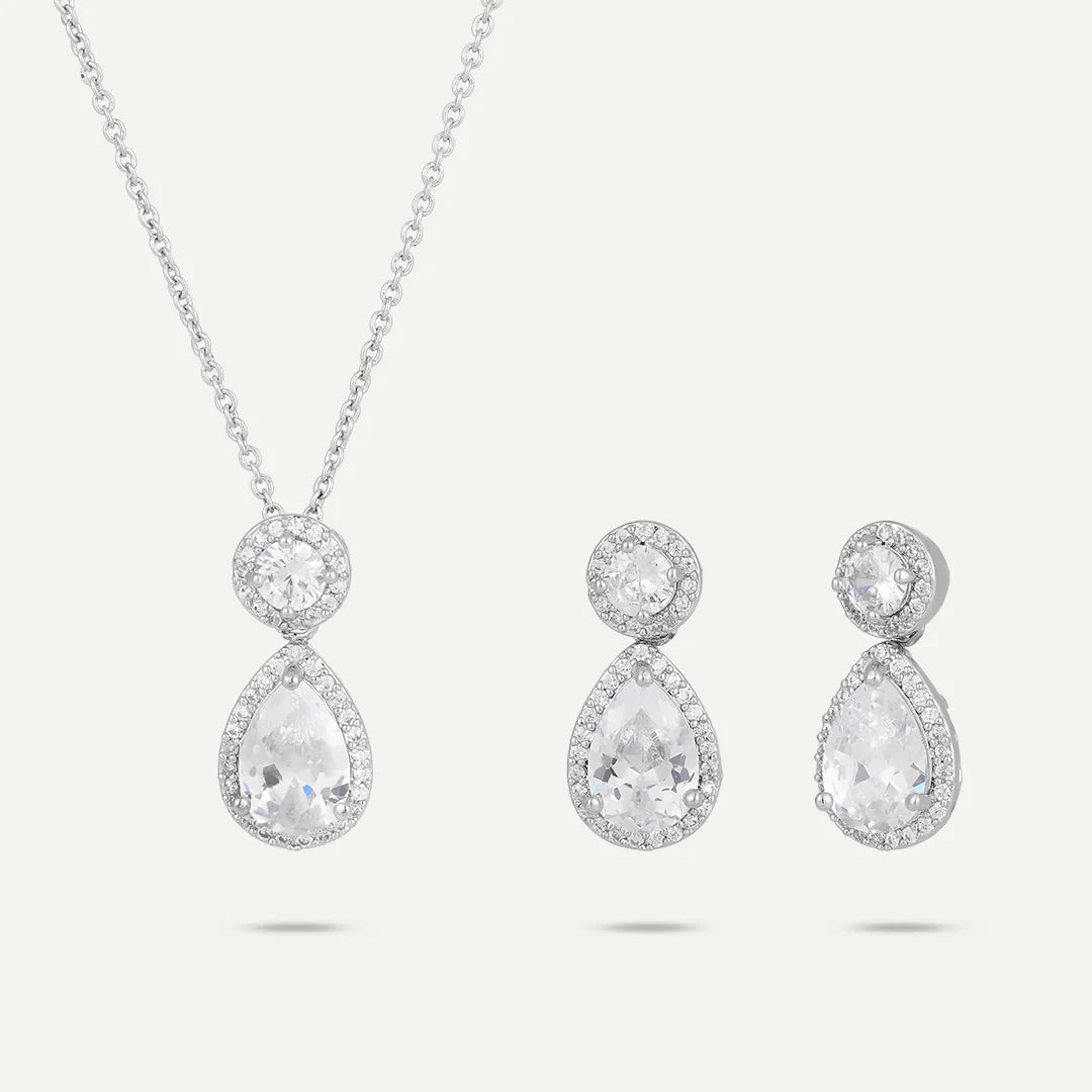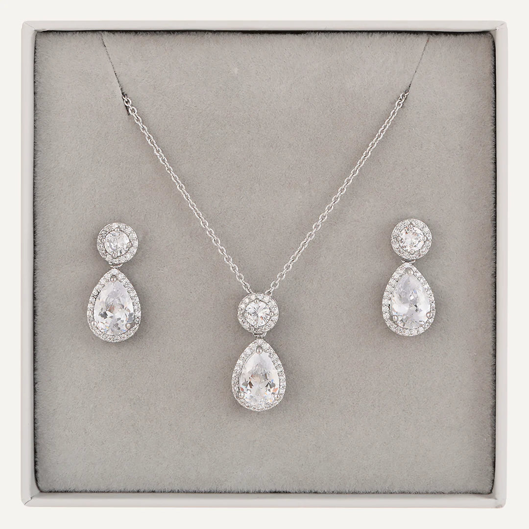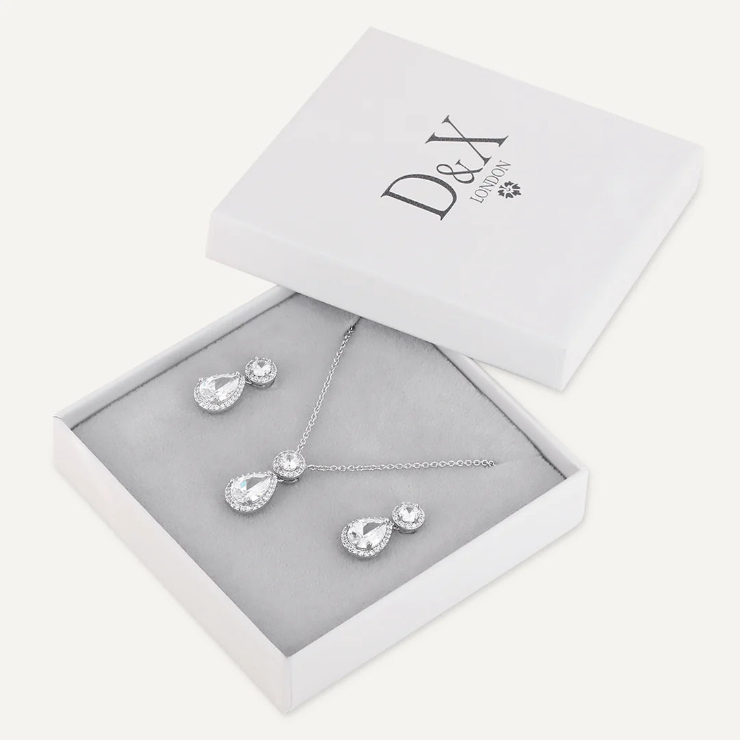 This stunning set includes a matching set of crystal earrings and a necklace.The elegant teardrop shapes make this set perfect for occasion wear.Placed in a beautiful velvet box, making it a special gift.