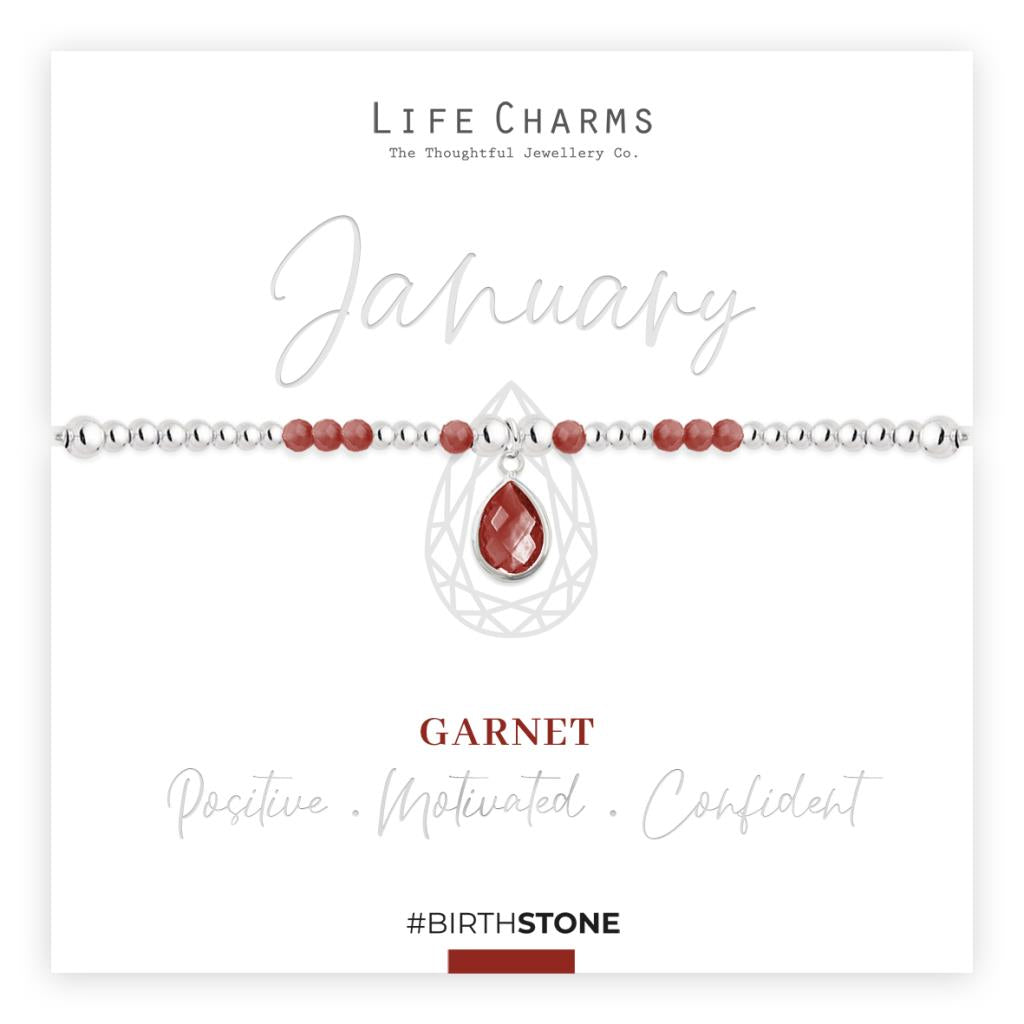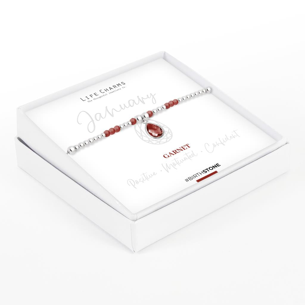 Adjustable slider January bracelet with elegant tear drop pendant and special dark red garnet gemstones