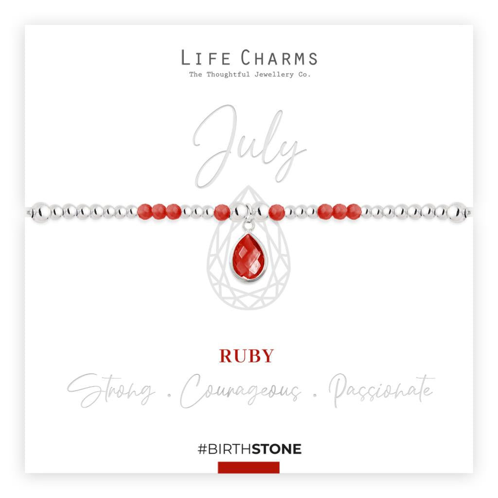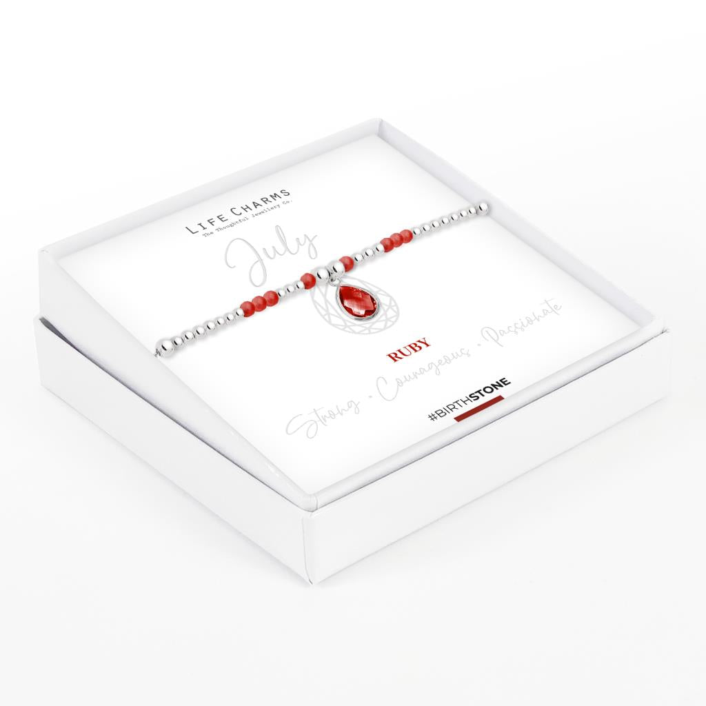 Adjustable slider July bracelet with elegant tear drop pendant and special red ruby gemstones