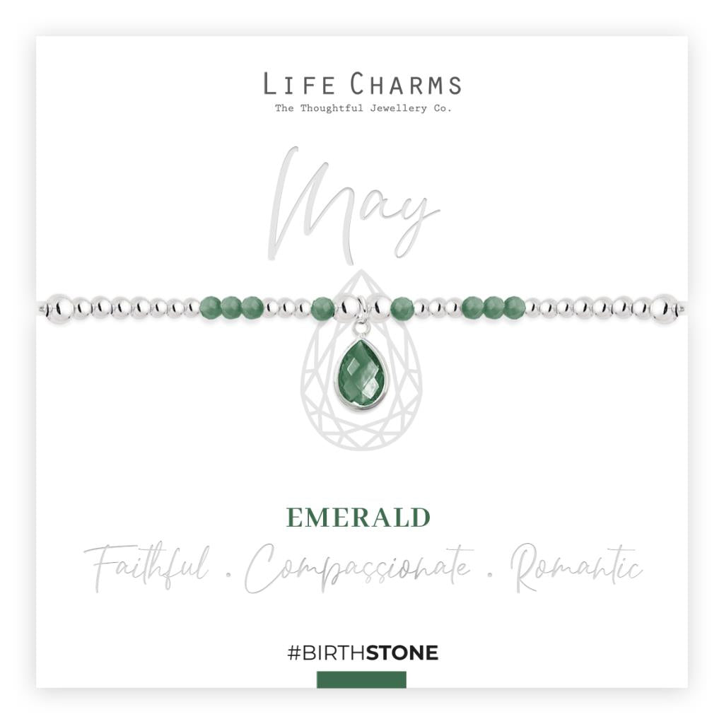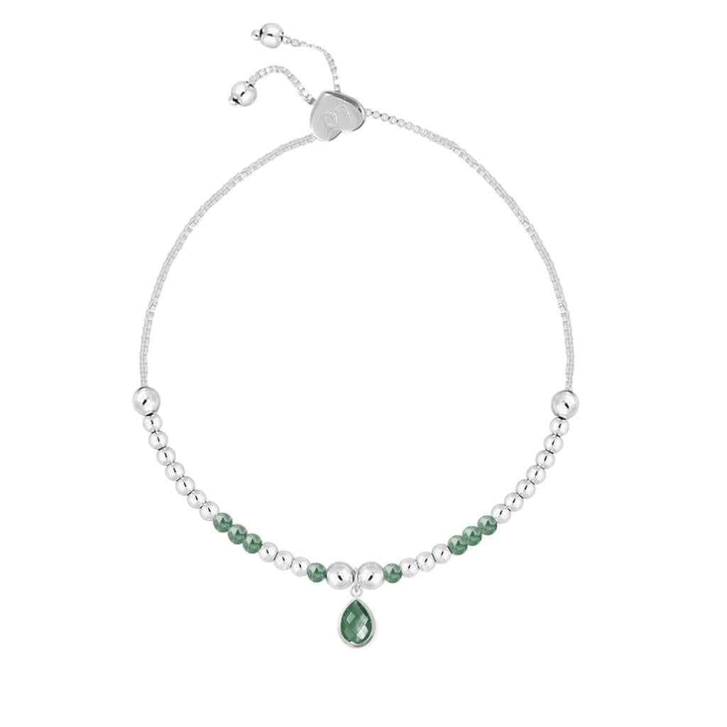 Adjustable slider May bracelet with elegant tear drop pendant and special dark green emerald gemstones.
