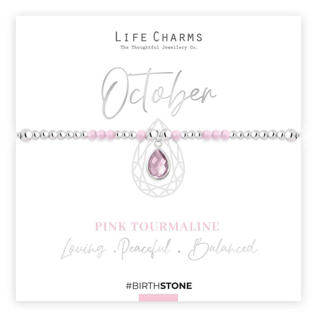 Adjustable slider October bracelet with elegant tear drop pendant and special pink tourmaline gemstones