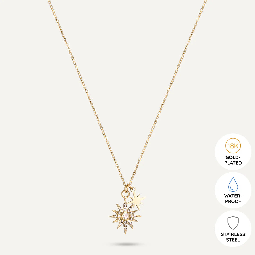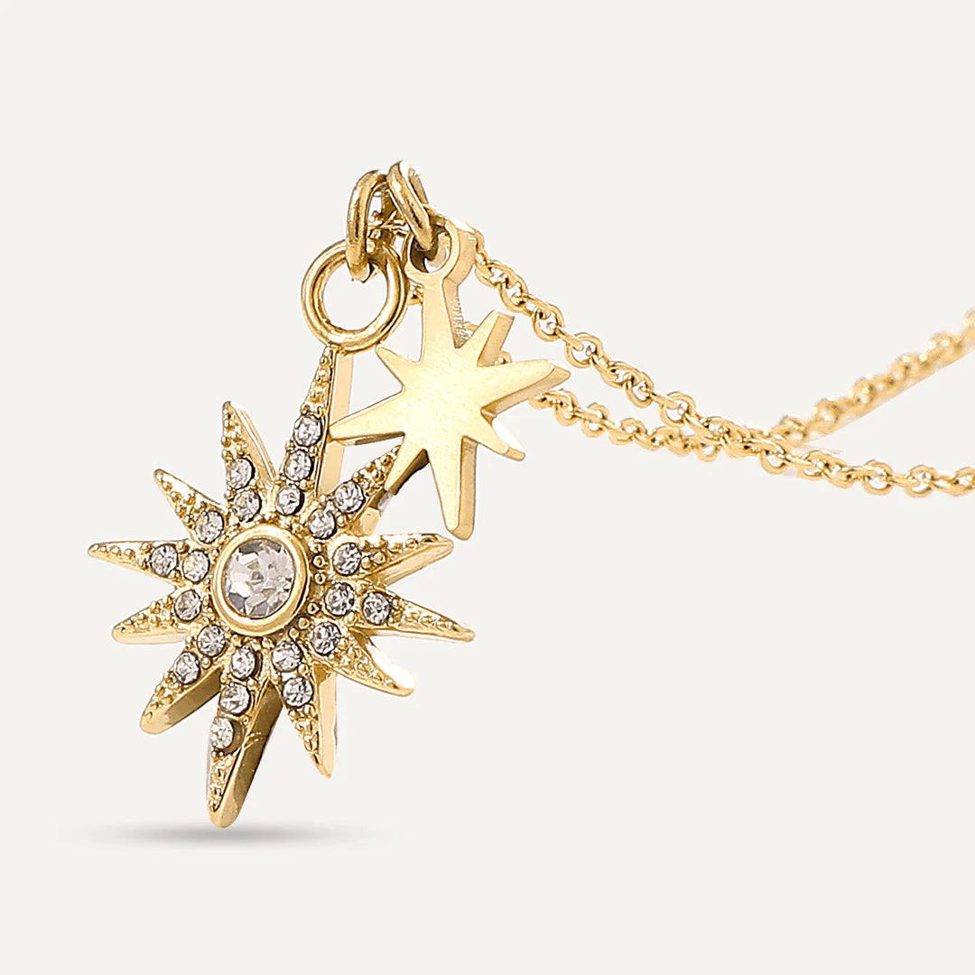 Featuring two dazzling star pendants, one adorned with shimmering crystals and the other with a sleek gold finish, this necklace captures the essence of the night sky. The delicate chain complements the radiant stars, creating a piece that effortlessly blends elegance and celestial beauty.